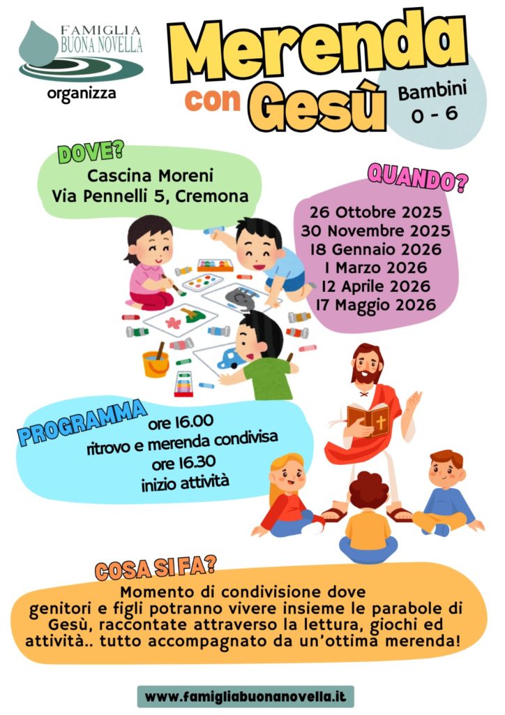 Un’esperienza coinvolgente per trasmettere amore ai nostri bimbi partendo dalle parabole di Gesù. Insieme ai loro bambini i genitori potranno fare l’esperienza di rivivere le parabole di Gesù attraverso la narrazione, il gioco e un momento di merenda insieme. Si parla un linguaggio molto concreto, fatto di esperienza, passione e intuizioni preziose per aiutare i genitori a vivere le “cose alte ed importanti” con la semplicità dei bambini e nella ordinaria quotidianità delle nostre giornate.